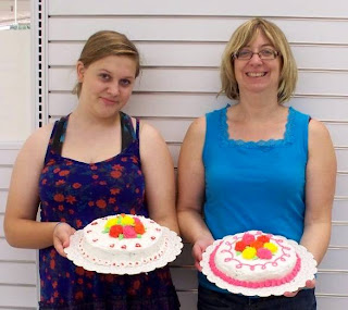 I taught my first Wilton cake decorating class at Joann Fabrics...We had so much fun.... Here are a couple of pictures of the girls with their cakes...
